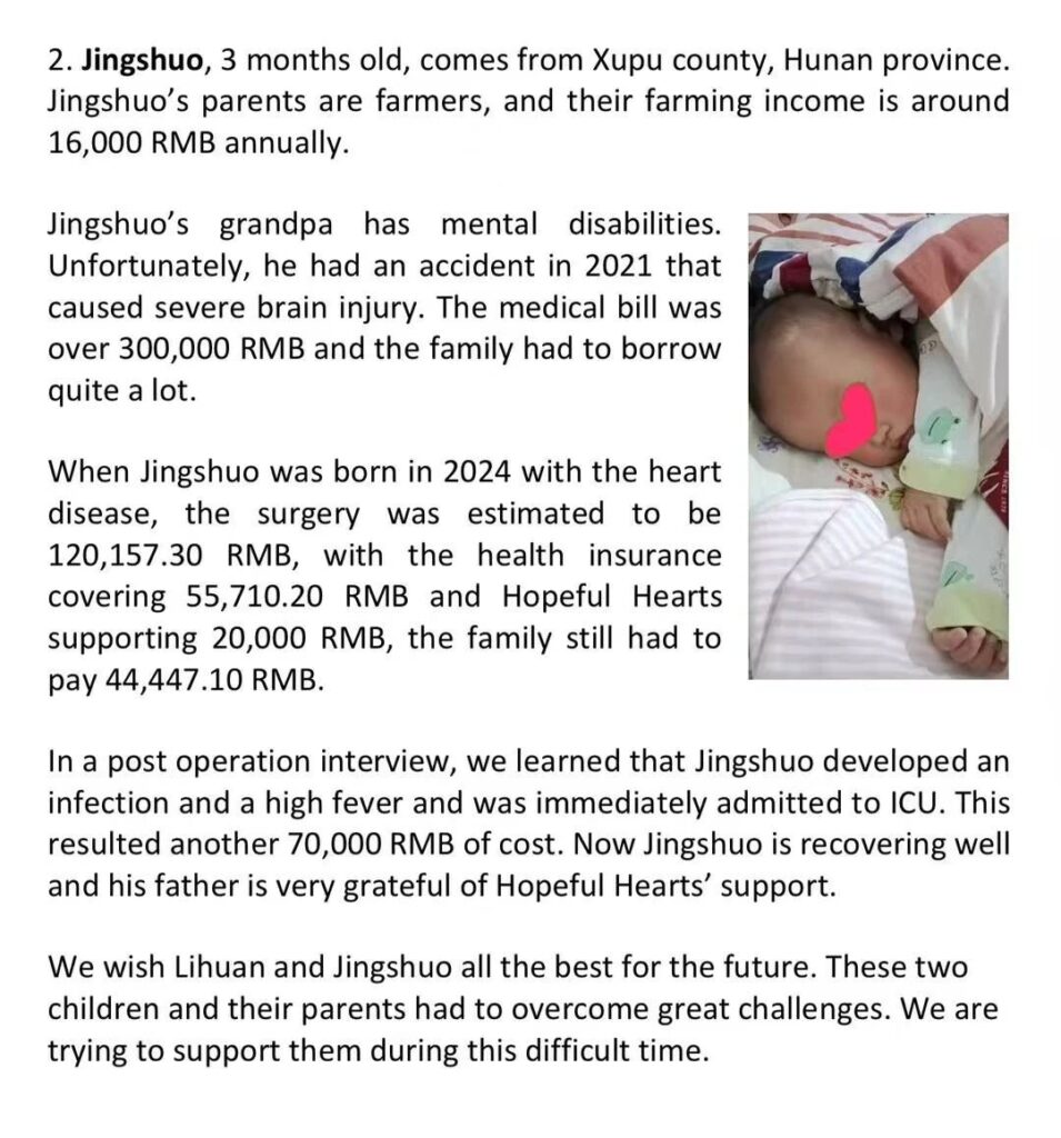 2.景烁,3个月大来自湖南溆浦。他的父母均是农民,年收入仅16000元。景烁的爷爷有精神障碍,不幸的是21年他又出意外导致了脑外伤,救治费用达30万,他们一家已四处借款。景烁24年出生时即发现患有先心病,手术费用达到12万元,医保报销近半数,“心的希望”资助了2万元,他们的资金还有很大缺口。